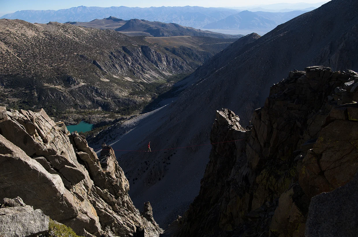 As a warm-up we ran an epic line on the Eichorn Pinnacle in Yosemite, and Jerry Miszewski walked it. I was burning to get into the Palisades, though, to put a line on Temple Crag and to go to new heights. So we hired a mule train, hauled all our stuff out there and ultimately ended up rigging an awesome line in exactly the spot I’d scouted out a year before.